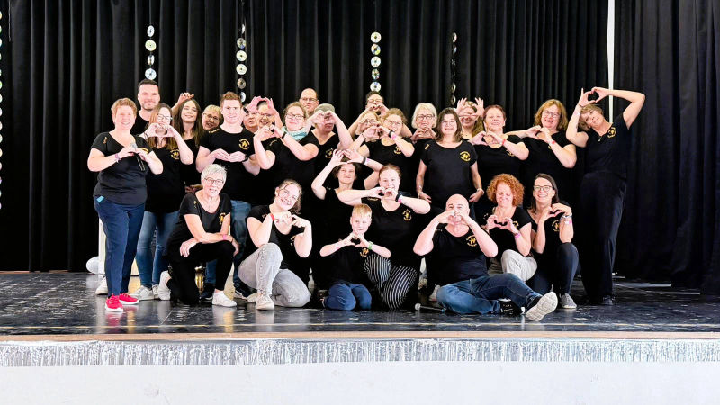 Choreograph Gudrun Schneider tanzt mit der Gruppe im Hintergrund